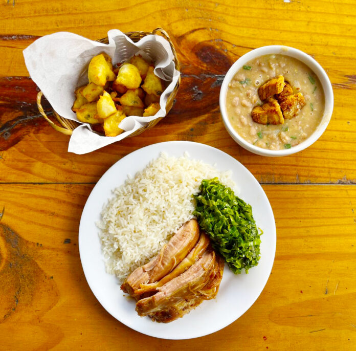 Para preparar a iguaria, a Chef utilizou como ingredientes o arroz branco, couve refogada na banha de porco, bolinho de mandioca, tutu de feijão carioquinha com torresmo frito e carne de porco de lata (feita e conservada na própria banha). De sobremesa, um tradicional pé de moleque.
