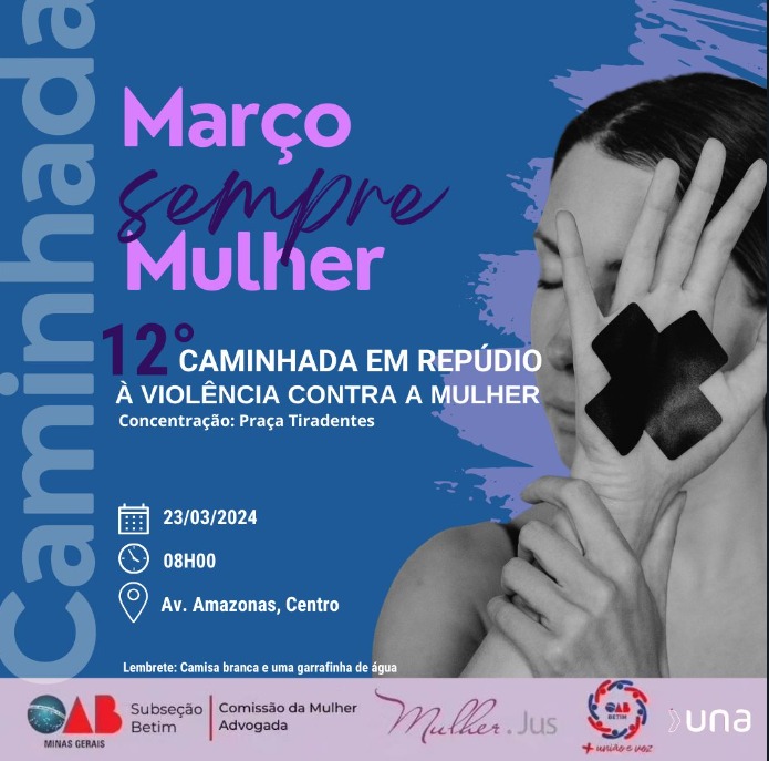 A Una Betim e a Ordem dos Advogados do Brasil (OAB) – Subseção Betim renovam a parceria em prol de um tema atual e urgente: o fim da violência contra a mulher. Com o objetivo de promover a conscientização e a mobilização da população betinense em torno dessa causa, as entidades promovem a 12ª Caminhada em repúdio à violência contra a mulher. A ação será realizada no sábado, dia 23 de março, a partir das 8 horas, com saída da Praça Tiradentes (Avenida Amazonas – Centro), em Betim.